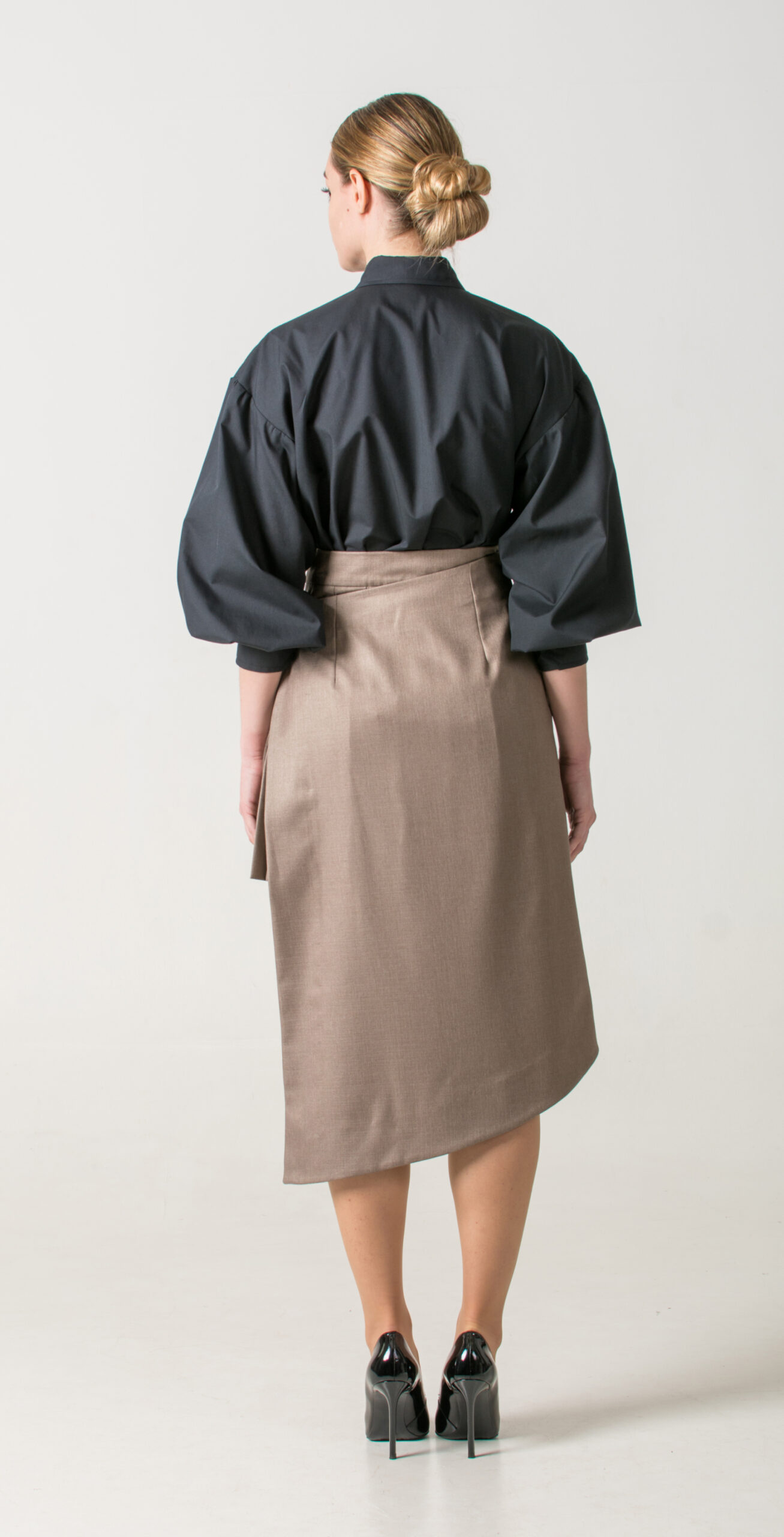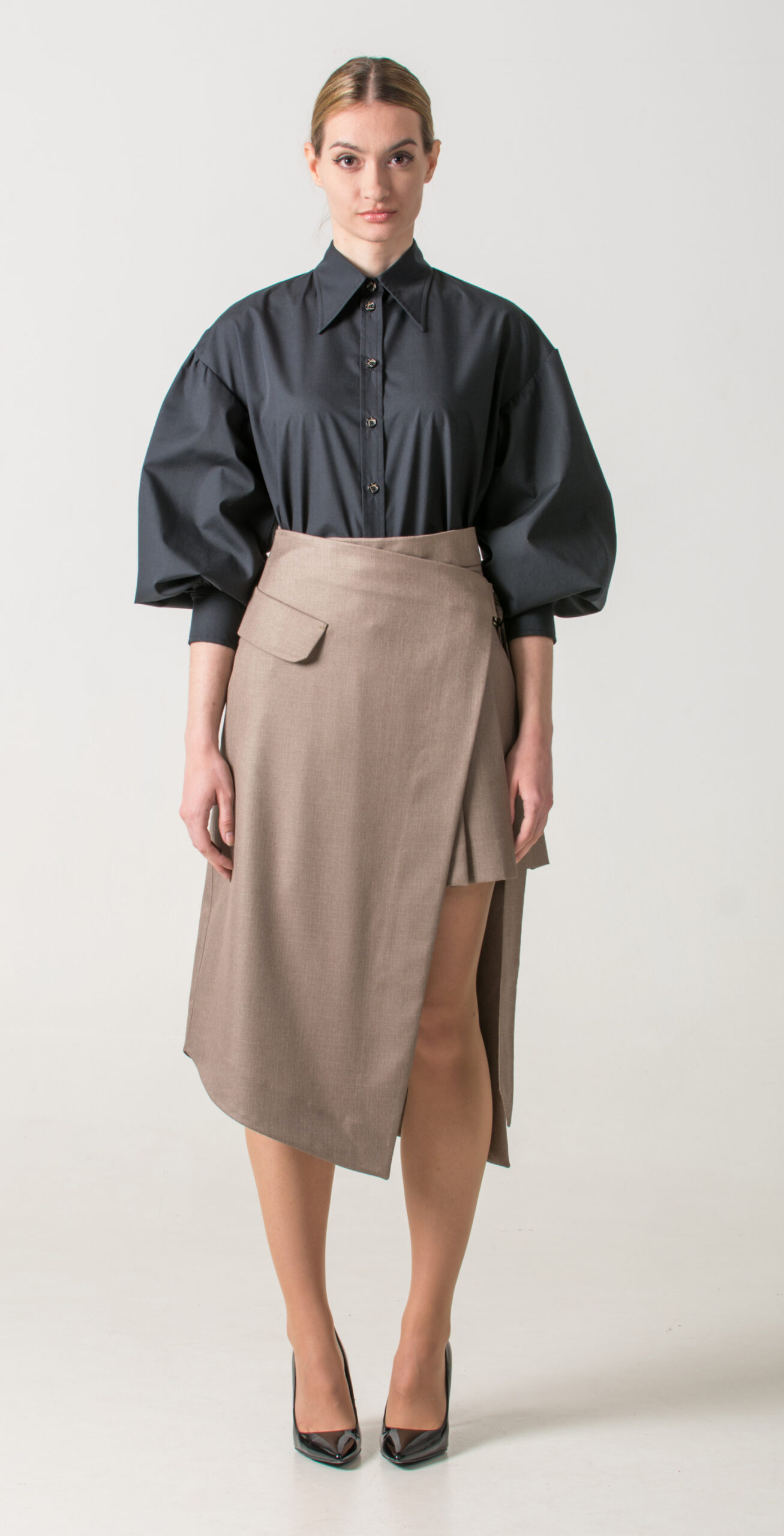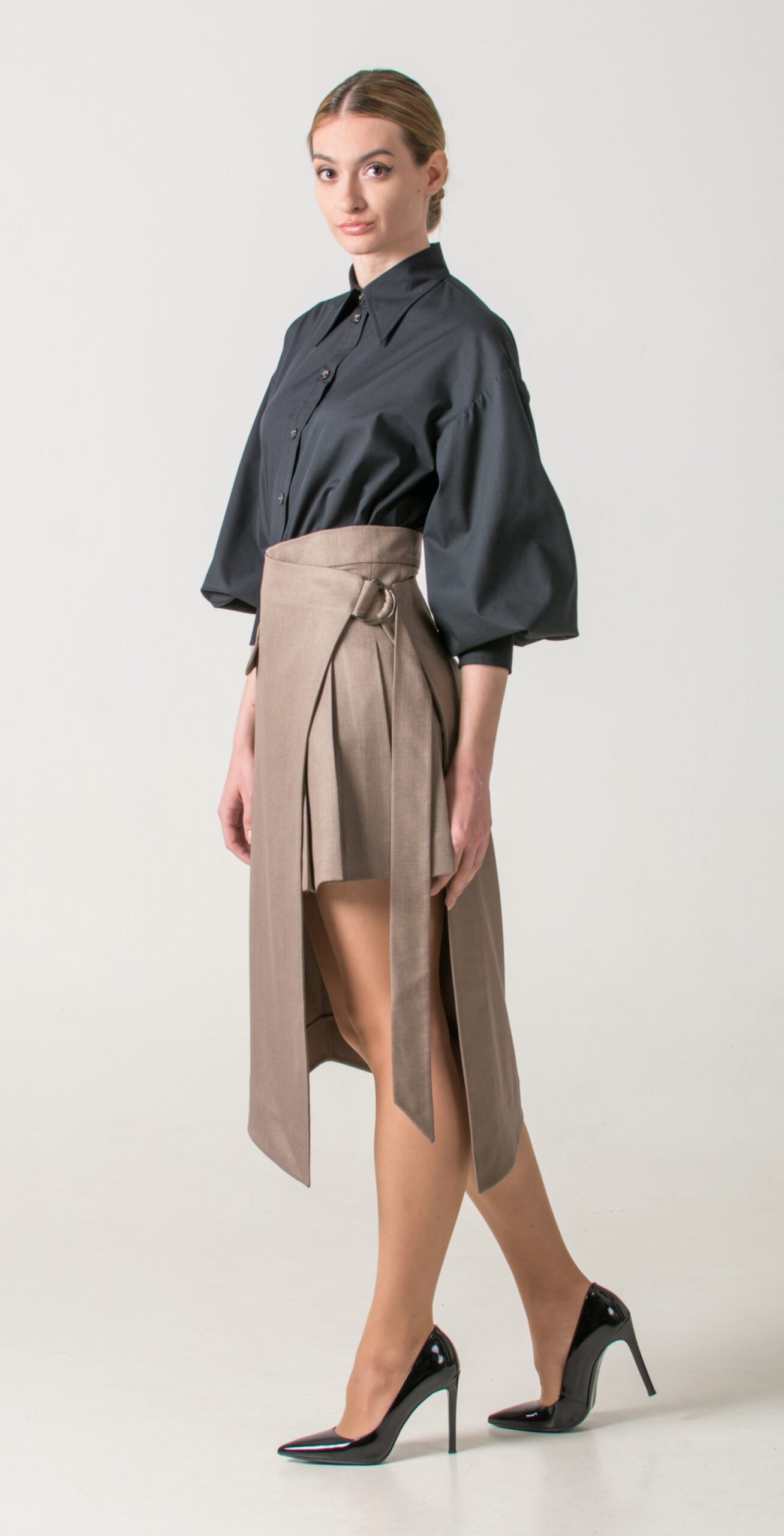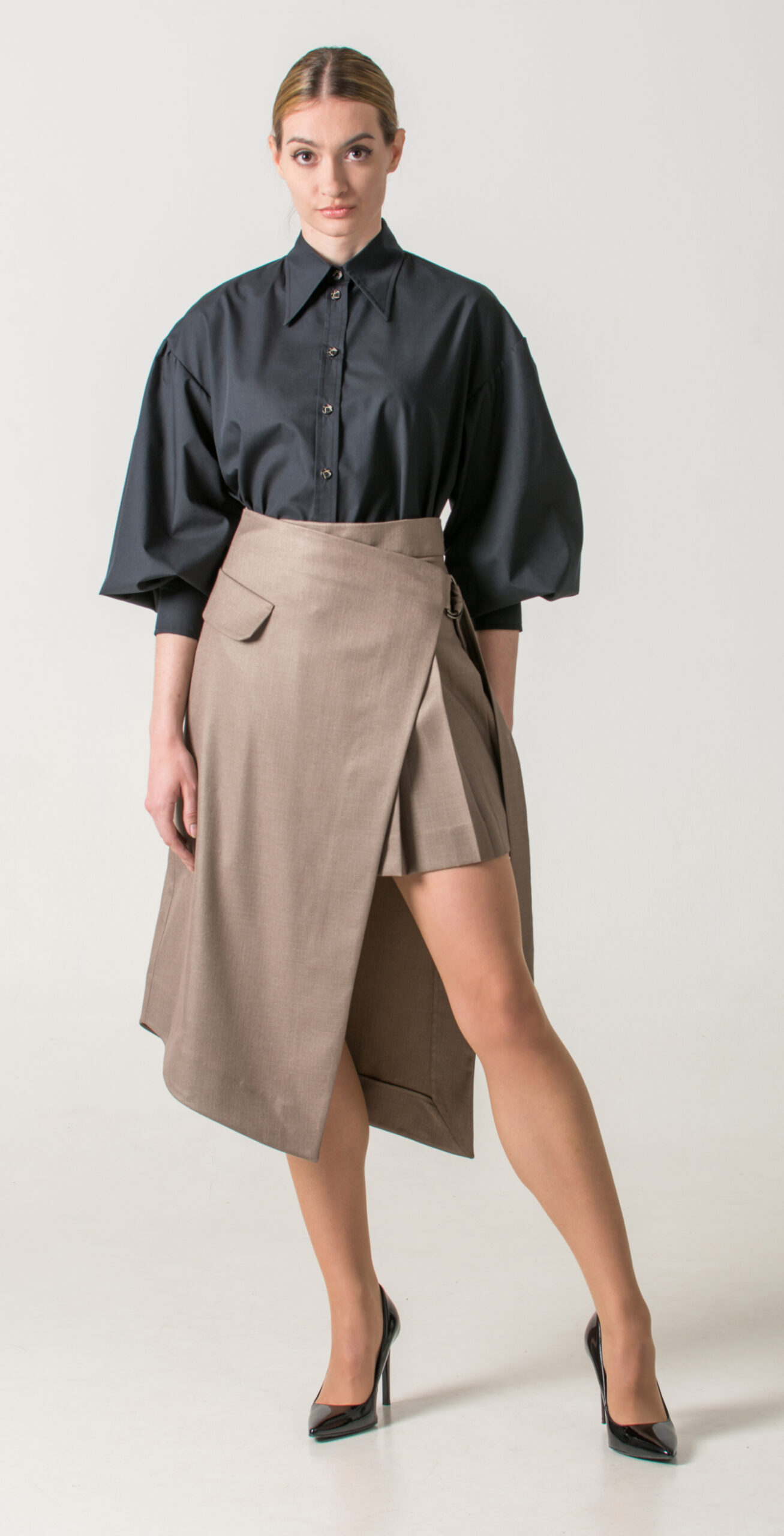 Pair a black shirt with wide sleeves and a classic collar with a pleated short skirt, then layer an asymmetrical long skirt over it to complete the look. This unexpected combination blends structure and flow, creating an eye-catching outfit.