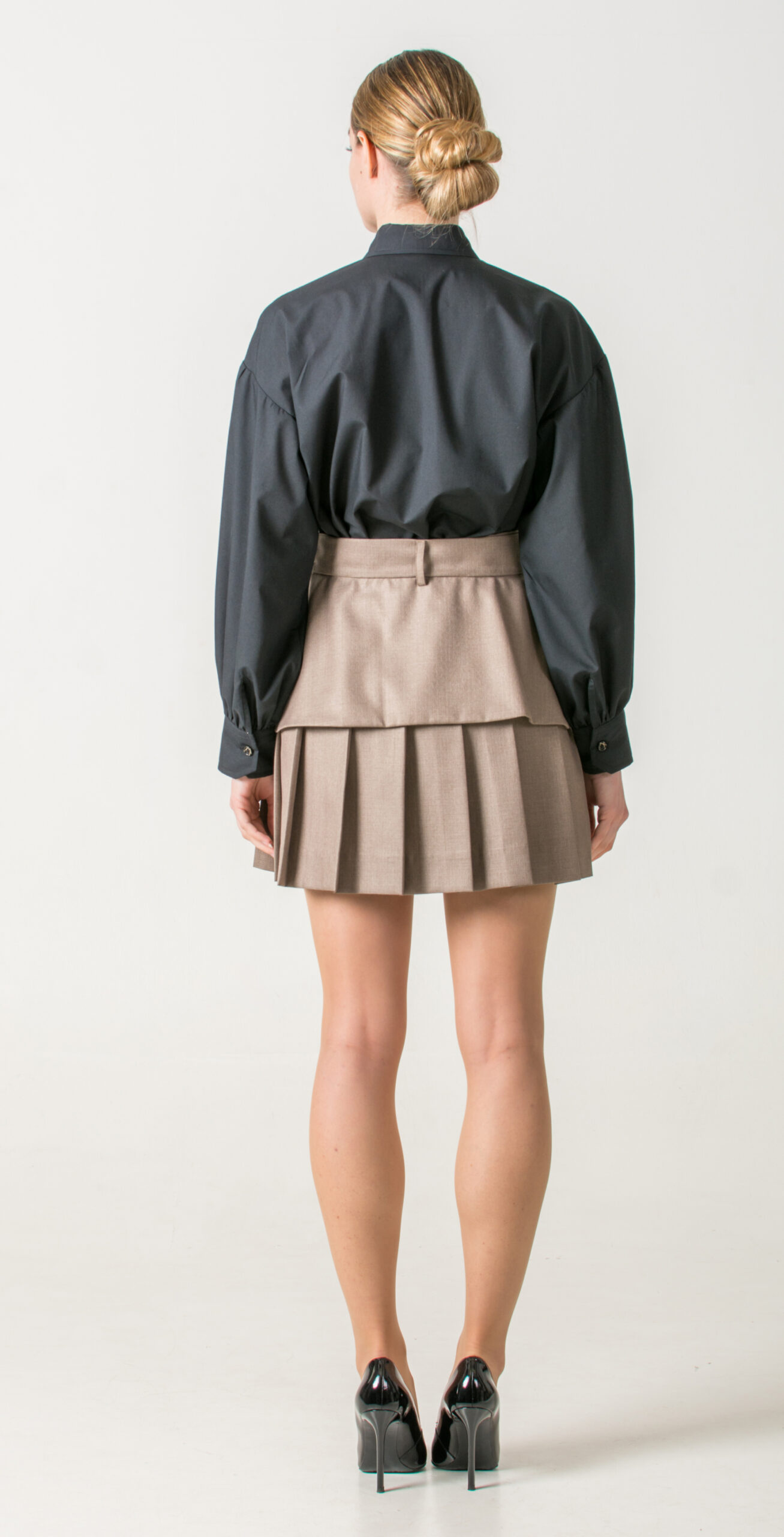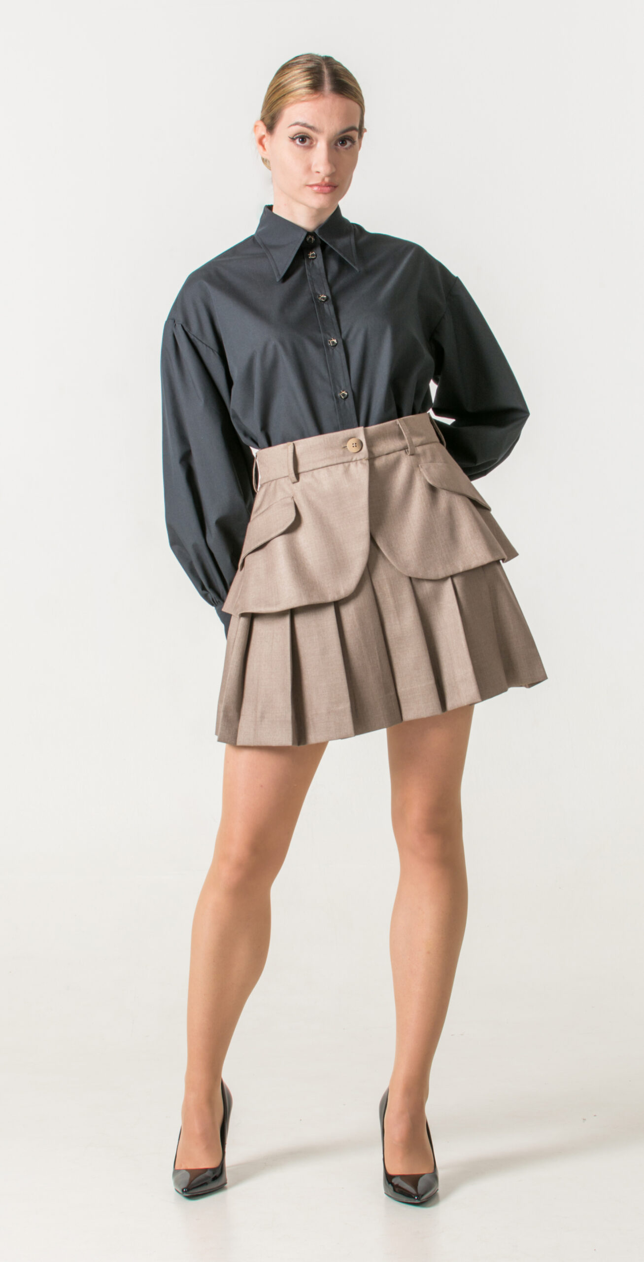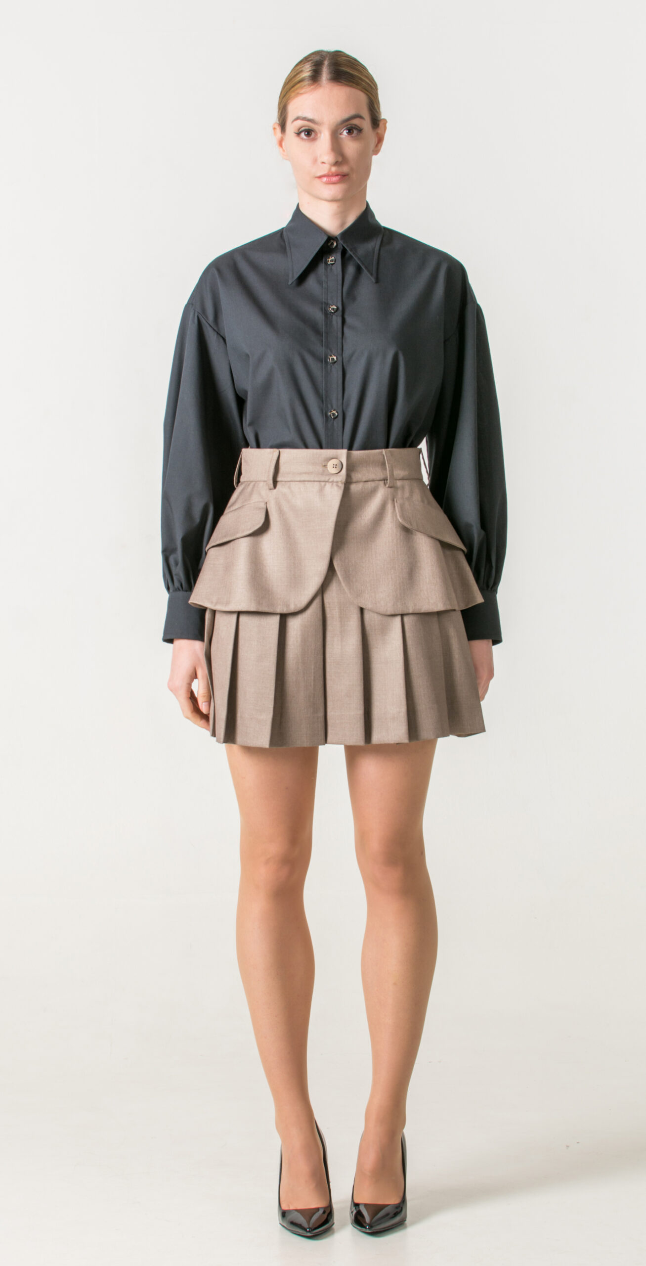 Pair a black shirt with wide sleeves with a pleated short skirt, then complete the look with a skirt-belt that echoes the tailored finish of a blazer’s lower half. This unexpected layering introduces a tailored edge to the look, making the outfit both distinctive and refined.