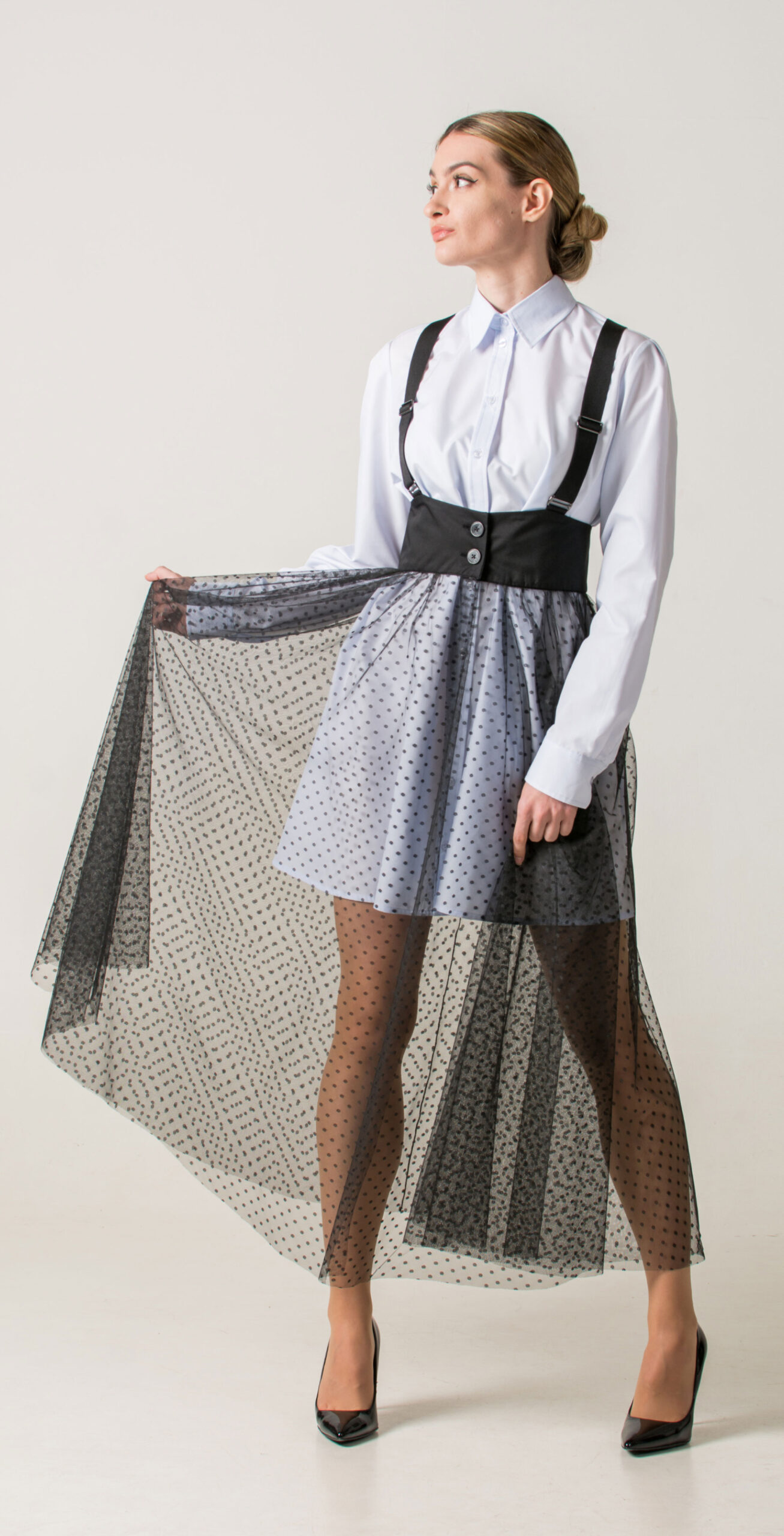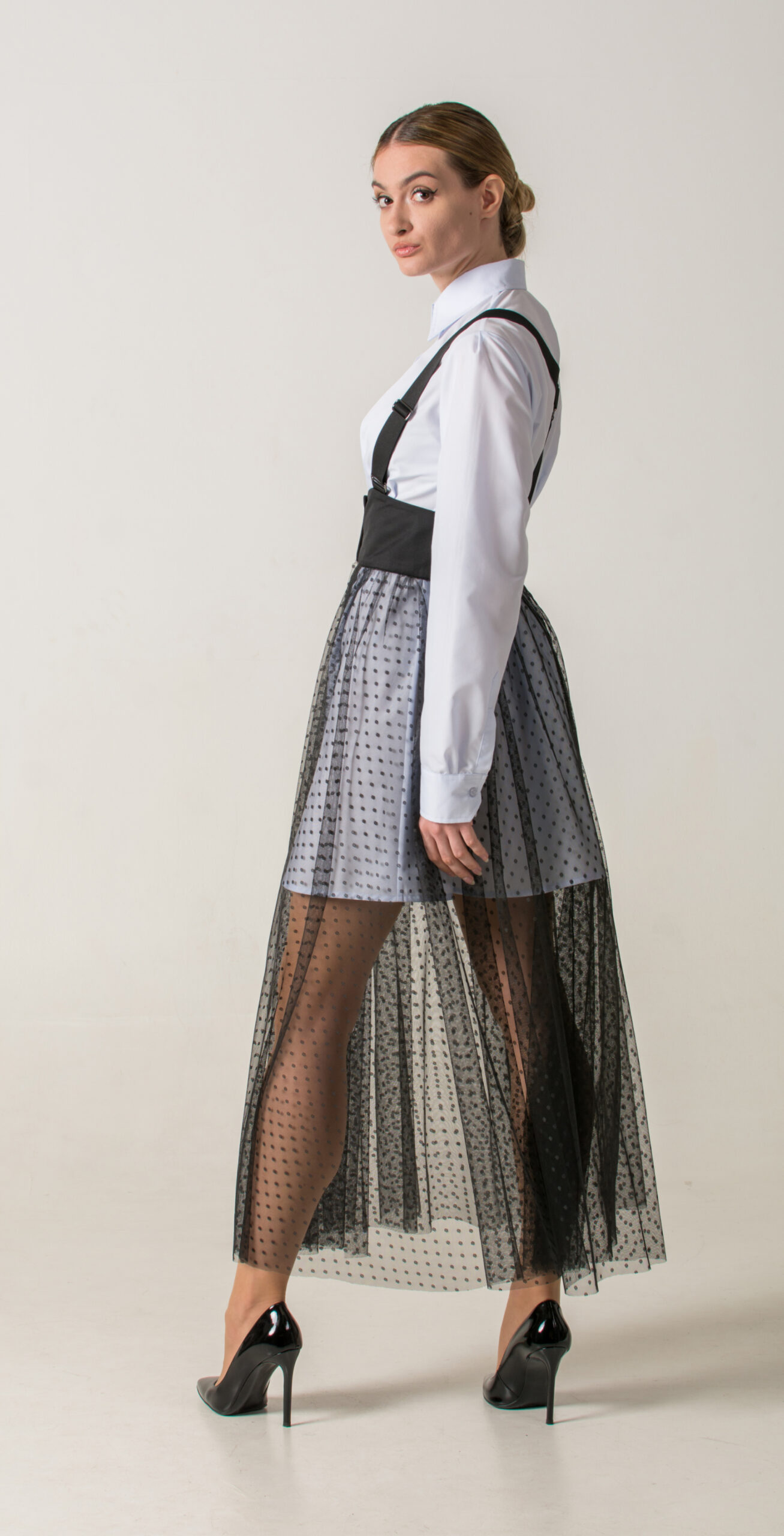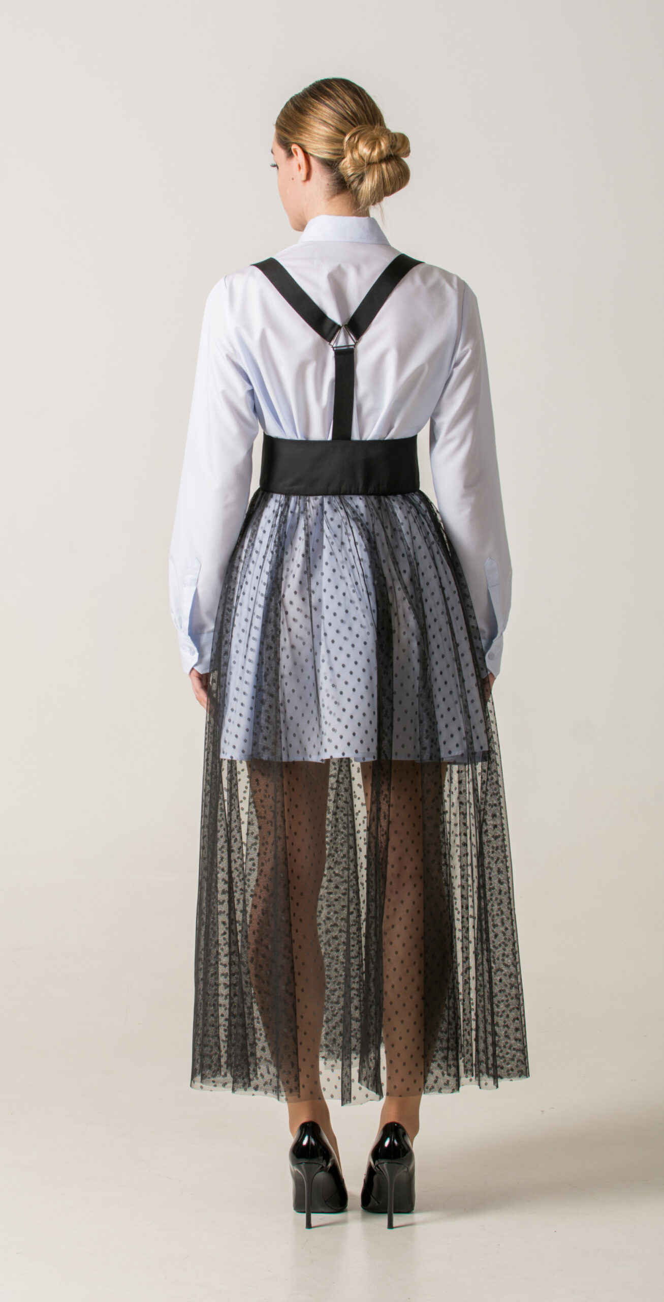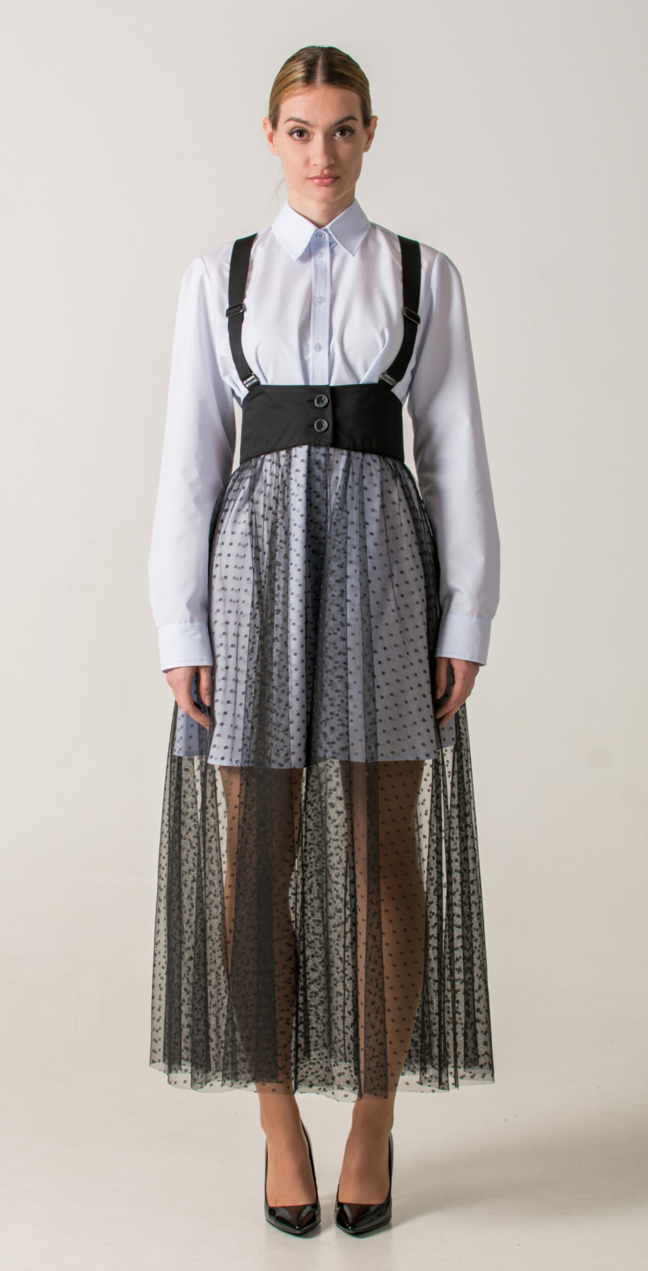 Product description: Long transparent polka-dot skirt with fitted belt, two-button closure, and Y-shaped back suspenders. A distinctive design that brings a romantic touch to the look.