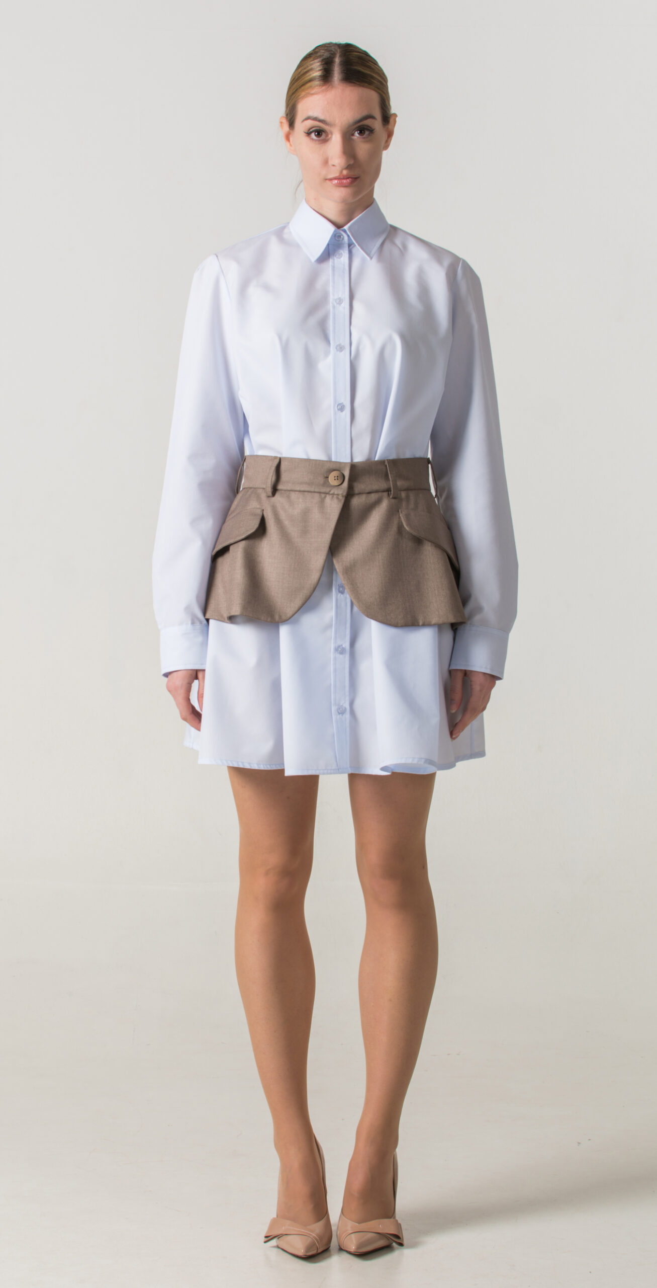 Style a classic shirt-dress with a skirt-belt that echoes the tailored look of a blazer’s lower half. This layering adds a structured twist to a timeless silhouette, resulting in a truly unique and sophisticated outfit.